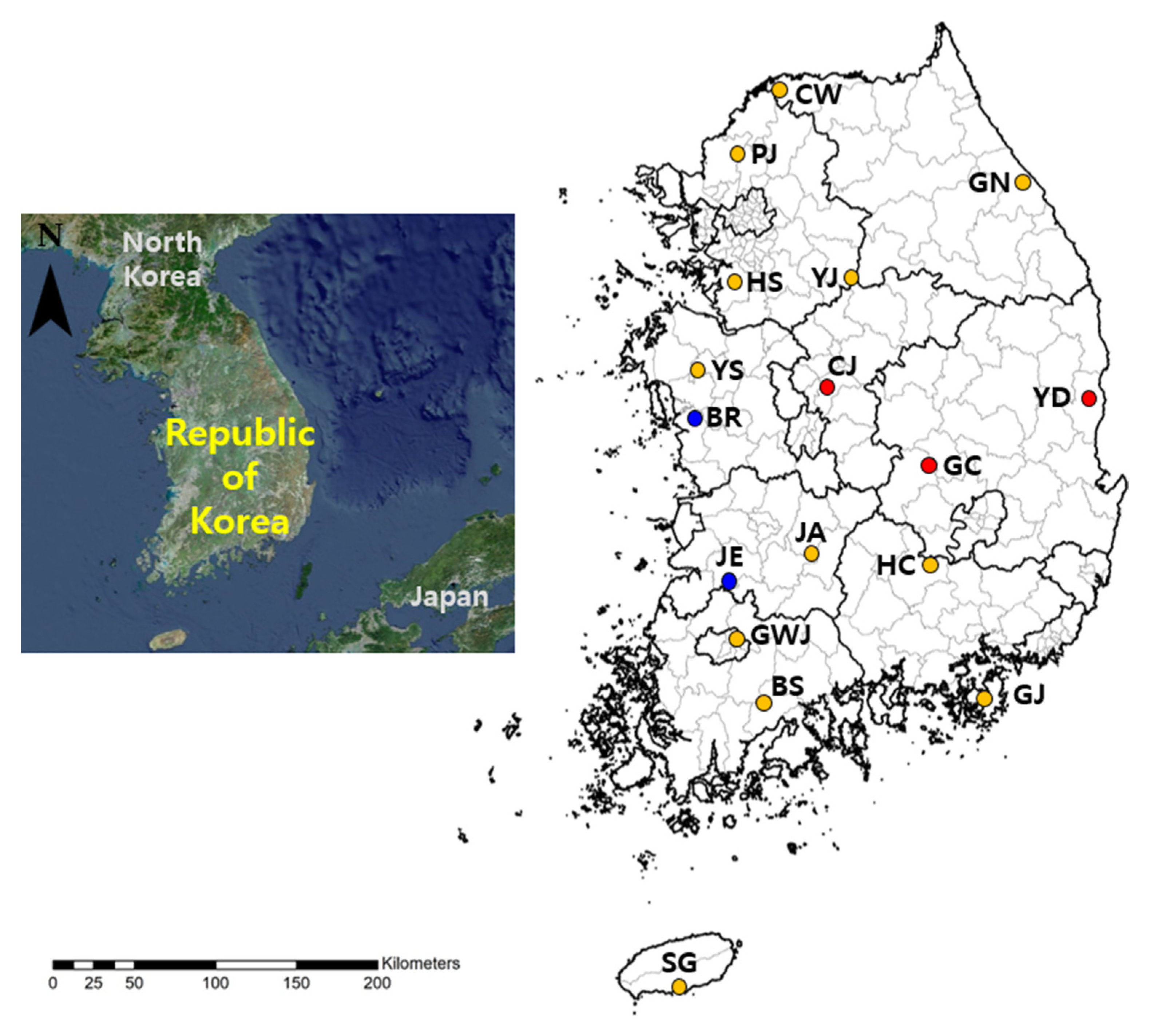 - Seo, M.-G.; Noh, B.-E.; Lee, H.S.; Kim, T.-K.; Song, B.-G.; Lee, H.I. Nationwide temporal and geographical distribution of tick populations and phylogenetic analysis of severe fever with thrombocytopenia syndrome virus in ticks in Korea, 2020. Microorganisms 2021, 9, 1630. [Google Scholar] [CrossRef]