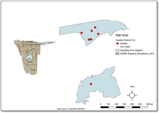Spatial Distribution of C. burnetii (Khomas and Zambezi Regions, Namibia). The dot represents positive foci.