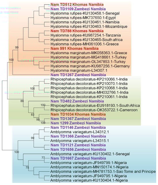 Phylogenetic analysis confirmed the initial BLAST identifications, with all Namibian sequences clustering within well-supported clades for Hyalomma rufipes, Rhipicephalus species, and a distinct Amblyomma variegatum.
