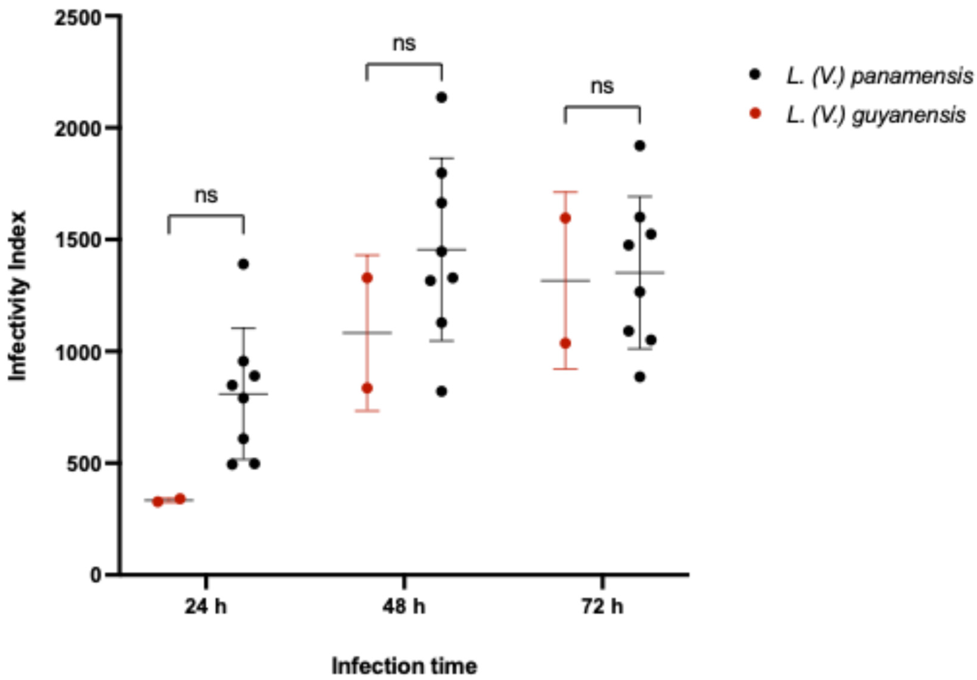 3.2. Infectivity Index (II) of Leishmania (Viannia) Isolates According to Species Stratification