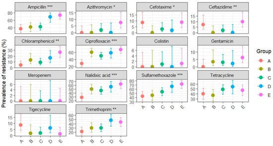 Dot-and-whisker plot of resistance prevalence (%) with 95% CIs for total E. coli from MacConkey agar isolated from broiler neck skin, stratified by category (A: organic, B: antibiotic-free, C: ATB-free after conventional, D: ATB-free before conventional, E: conventional). Asterisks indicate the level of statistical significance for overall group differences (Chi-square or Fisher’s exact test): p < 0.05 (*), p < 0.01 (**), p < 0.001 (***).