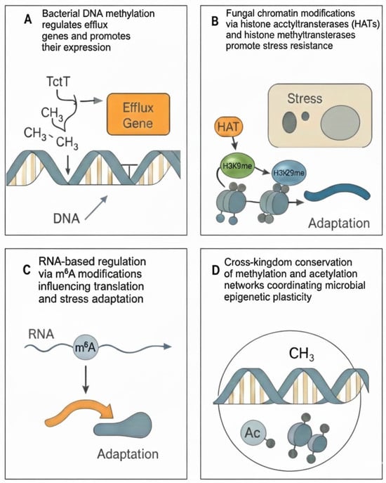 Epigenetic mechanisms underlying antibiotic resistance across bacteria and fungi. (A) Bacterial DNA methylation regulates the expression of efflux genes. (B) Fungal chromatin modifications via histone acetyltransferases (HATs) and histone methyltransferases promote stress resistance. (C) RNA-based regulation via m6A modifications influencing translation and stress adaptation. (D) Cross-kingdom conservation of methylation and acetylation networks coordinating microbial epigenetic resilience.