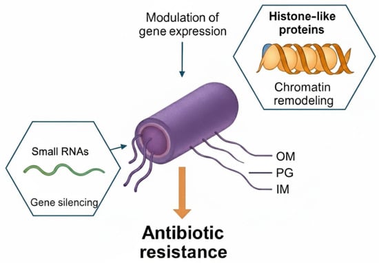 Bacterial epigenetic regulation of antibiotic resistance by small RNAs and histone-like proteins. Small non-coding RNAs (small RNAs) contribute to gene silencing by base-pairing with target transcripts and modulating mRNA stability or translation. Histone-like proteins remodel chromatin-like nucleoid structure and alter accessibility of resistance-associated genes. Together, these RNA- and protein-based epigenetic regulators modulate gene expression programs that promote antibiotic resistance in Gram-negative bacteria. Abbreviations: IM, inner membrane; OM, outer membrane; PG, peptidoglycan layer; sRNA, small RNA.