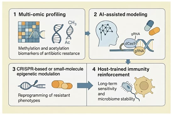 CRISPR-based epigenetic modulation offers a paradigm shift, from killing pathogens to retraining their regulatory systems. The future lies in developing hybrid tools that couple CRISPR precision with real-time methylation tracking, enabling closed-loop epigenetic therapy. The integration of third-generation sequencing (TGS) data with CRISPR analytics will facilitate personalized antimicrobial strategies, allowing for dynamic adjustments to methylation circuits during treatment [13,35,41]. Translating these CRISPR-based epigenetic tools from in vitro systems into in vivo infection models introduces several additional challenges. First, delivery platforms must reliably reach chronic infection niches such as biofilms, intracellular reservoirs, or poorly perfused tissues, while maintaining sufficient expression of dCas-based editors and guide RNAs. Second, the biodistribution and persistence of CRISPR carriers (e.g., phages, plasmids, or nanocarriers) need to be carefully mapped in animal models to minimize unintended exposure of non-target microbes and host cells. Third, off-target epigenetic effects, both within the pathogen population and in host tissues, must be systematically profiled, together with longitudinal monitoring of the commensal microbiome, to ensure that epigenetic reprogramming does not induce dysbiosis or immune dysregulation. Early preclinical work combining CRISPR-based antimicrobials with microbiome-targeted strategies has begun to explore these issues. Still, comprehensive in vivo biodistribution and microbiome-impact data remain limited and will be essential for clinical translation [41].