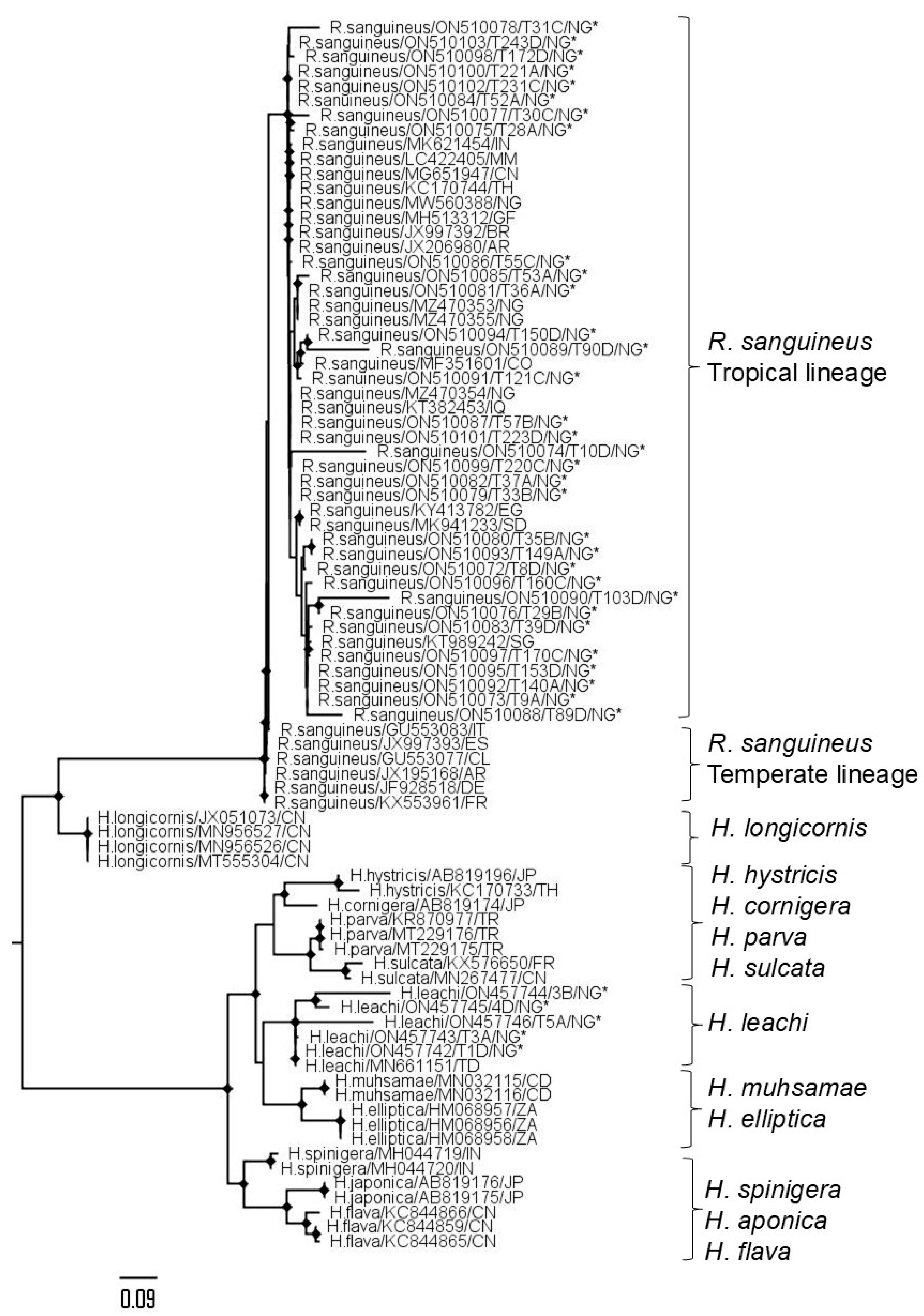 - Kamani, J. Molecular identification and genetic analysis of Rhipicephalus sanguineus sensu lato of dogs in Nigeria, West Africa. Exp. Appl. Acarol. 2021, 85, 277–289. [Google Scholar] [CrossRef]
