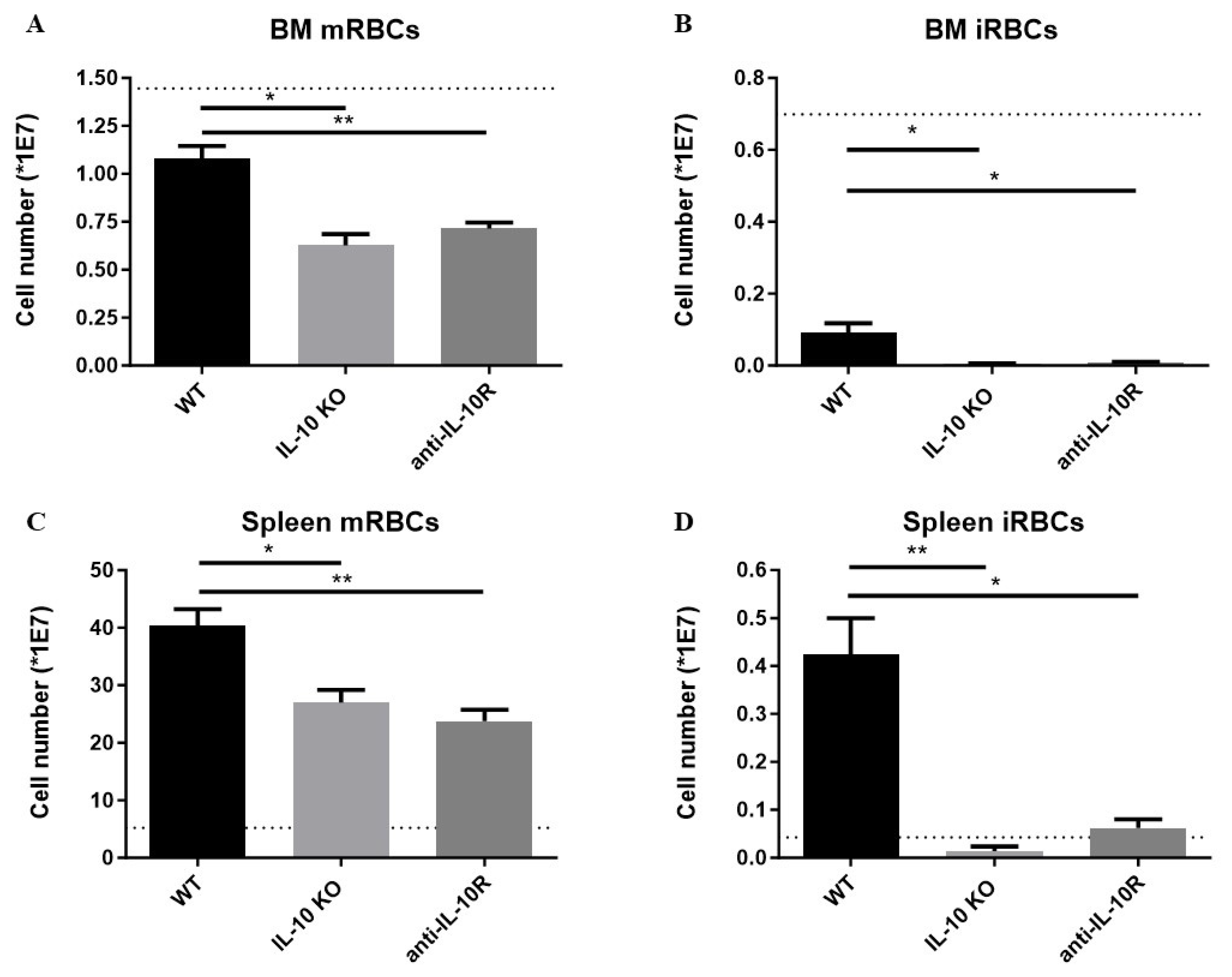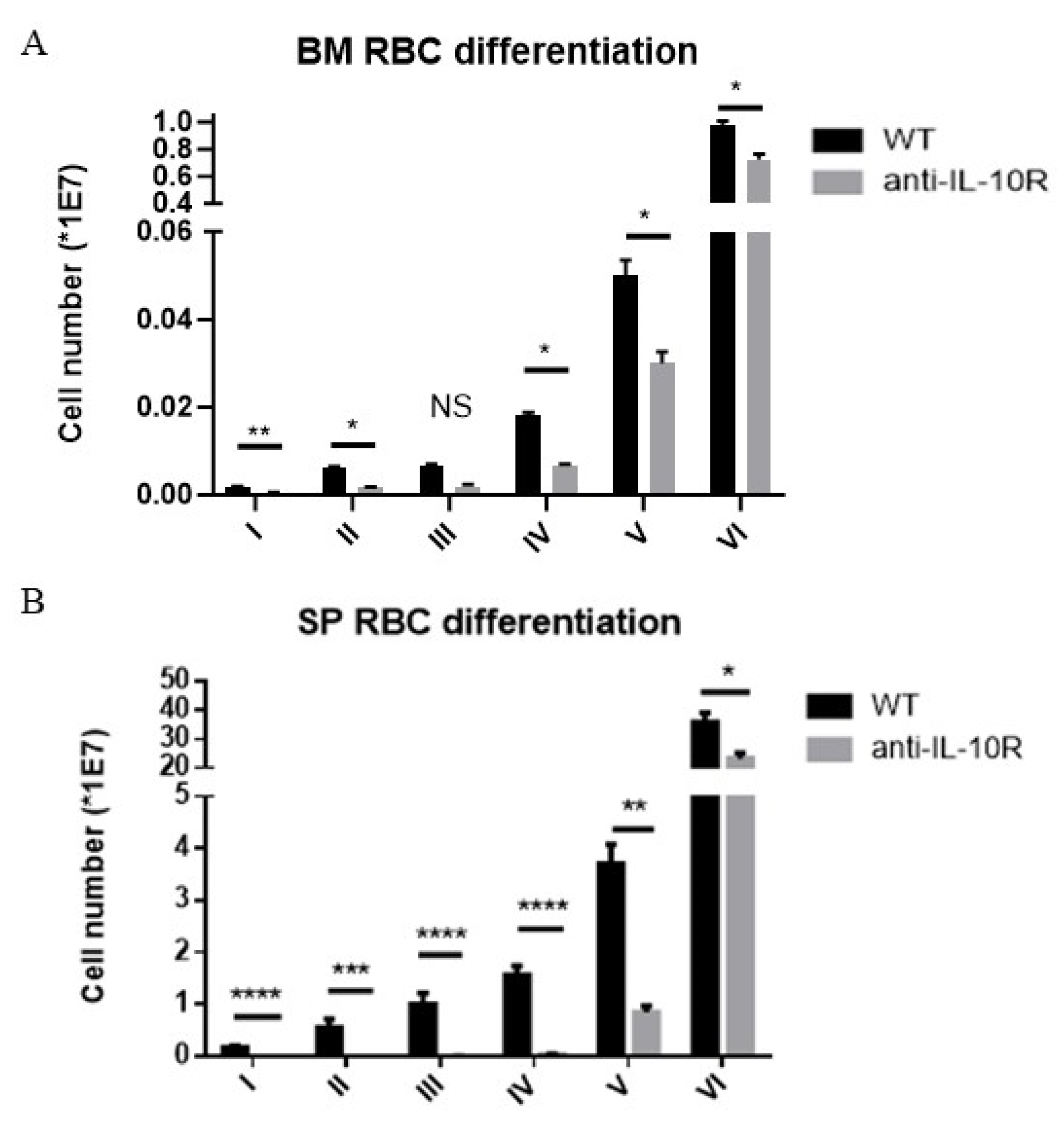 3.2. IL-10 Deficiency Negatively Affects the Early Stages of RBC Differentiation Within the Bone Marrow and Spleen During AT