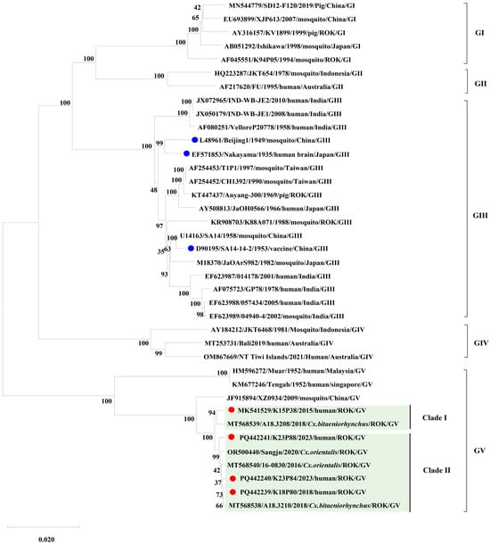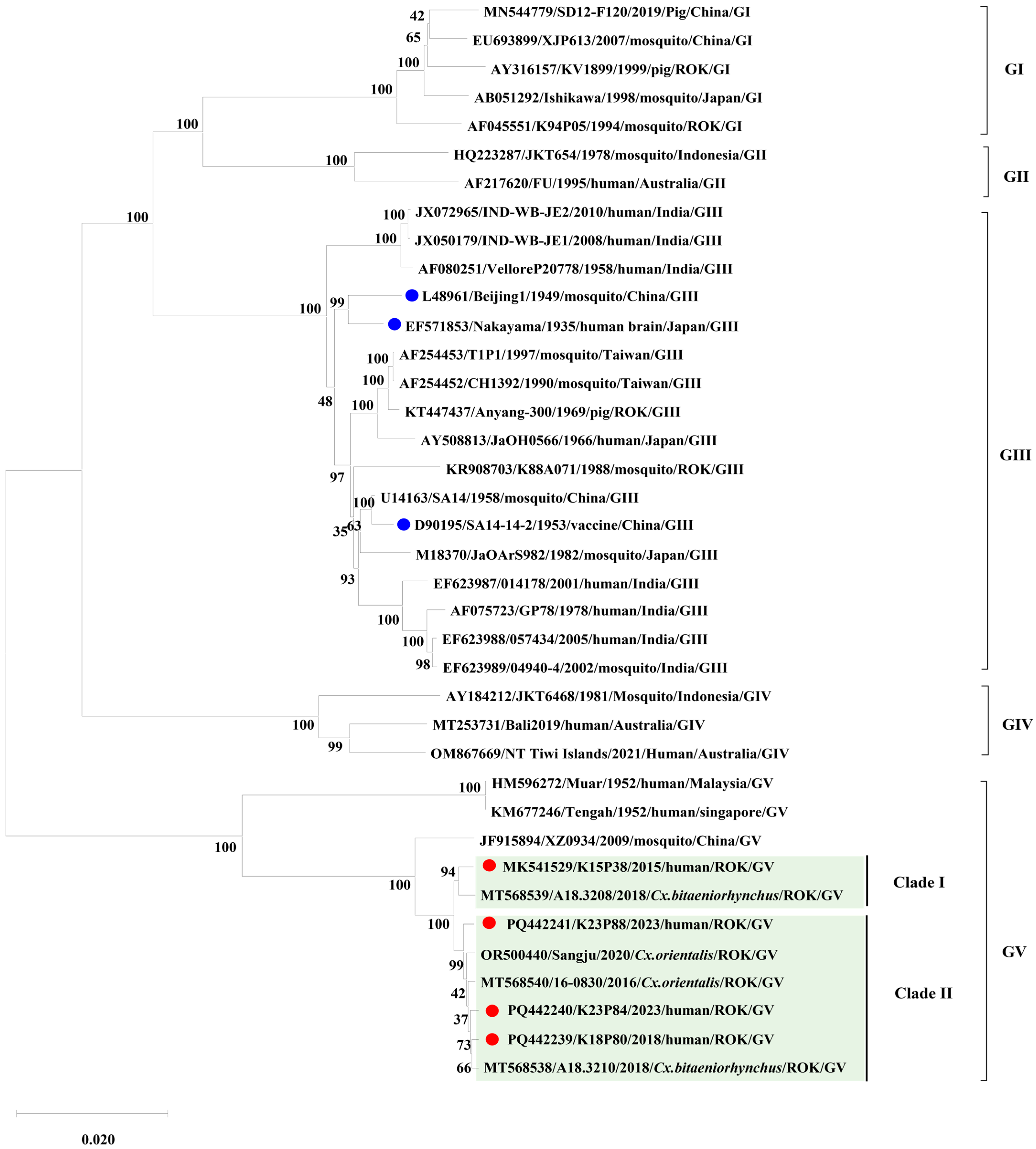 Phylogenetic analysis of Japanese encephalitis virus (JEV) isolates. Phylogenetic analysis was conducted using complete ORF sequences (10,302 nt) of Korean human-derived JEV GV isolates (K15P38, K18P80, K23P84, K23P88) together with representative reference strains of all five JEV genotypes (GI–GV), including vaccine strains (SA14-14-2, Nakayama, and Beijing-1). The tree was constructed using the maximum-likelihood method (1000 bootstrap replicates) in MEGA 11. Vaccine strains are indicated with blue dots, and Korean human-derived isolates are indicated with red dots to clearly distinguish the strain categories. Korean isolates clustered within genotype V (GV) and were clearly separated into two distinct clades: Clade I (K15P38) and Clade II (K18P80, K23P84, K23P88). Bootstrap support values ≥ 70% are indicated at the corresponding nodes. The scale bar represents nucleotide substitutions per site.