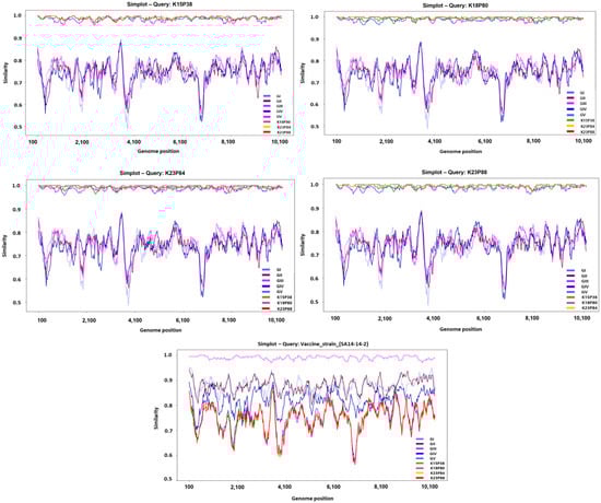 SimPlot analysis of domestic JEV GV isolates compared with reference strains. SimPlot-based nucleotide similarity analyses were performed using the four Korean human-derived JEV GV isolates, K15P38, K18P80, K23P84, and K23P88, as query sequences. Each panel shows the nucleotide similarity (%) between the query sequence and representative reference strains of the five JEV genotypes (GI–GV), calculated across the complete ORF (10,302 nt) using a sliding-window approach (window size: 200 nt; step size: 20 nt). Genotype-specific similarity profiles are color-coded (right legend), and the gray dashed line marks the 80% similarity threshold. All Korean isolates consistently exhibited the highest similarity to the GV reference strain, clearly differentiating them from GI–GIV and vaccine strains.