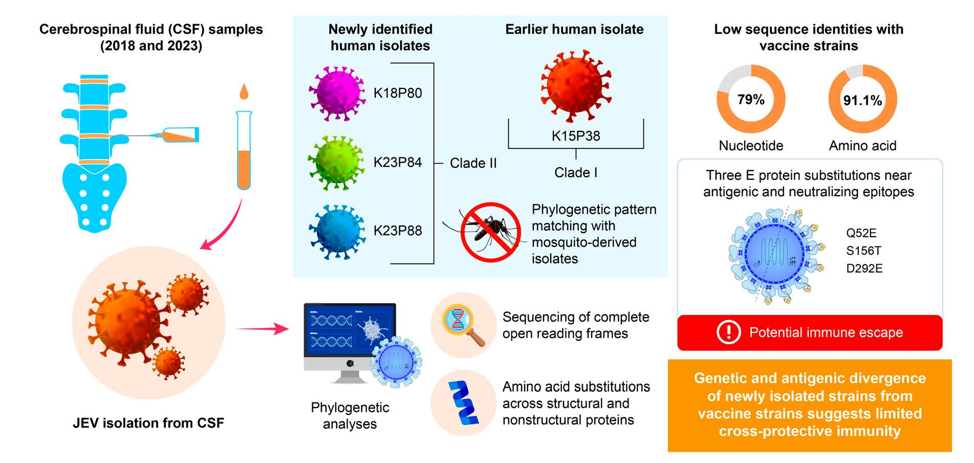 Through comprehensive genome analysis of four human-derived JEV GV isolates from Korea, we identified two distinct co-circulating clades (Clades I and II) within the domestic GV population. These isolates showed clear genetic and antigenic differences from genotype III (GIII) vaccine strains, indicating possible limitations in cross-protective effectiveness. Additionally, identical molecular phylogenetic features between human- and mosquito-derived isolates suggest ongoing local circulation between human and vector populations. This study emphasizes the importance of CSF-based diagnosis and provides essential baseline data for the advancement of next-generation JEV vaccine and improved surveillance strategies.