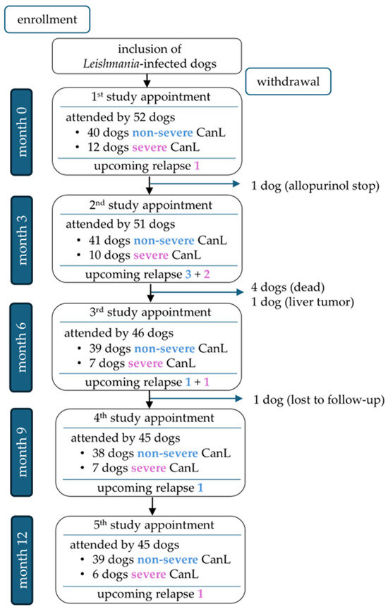 Overview of dogs attending the study appointments at months 0, 3, 6, 9, and 12, divided into non-severe cases (blue font; LeishVet stages I–II) and severe cases (pink font; LeishVet stages III–IV) [33], including upcoming relapses per group.