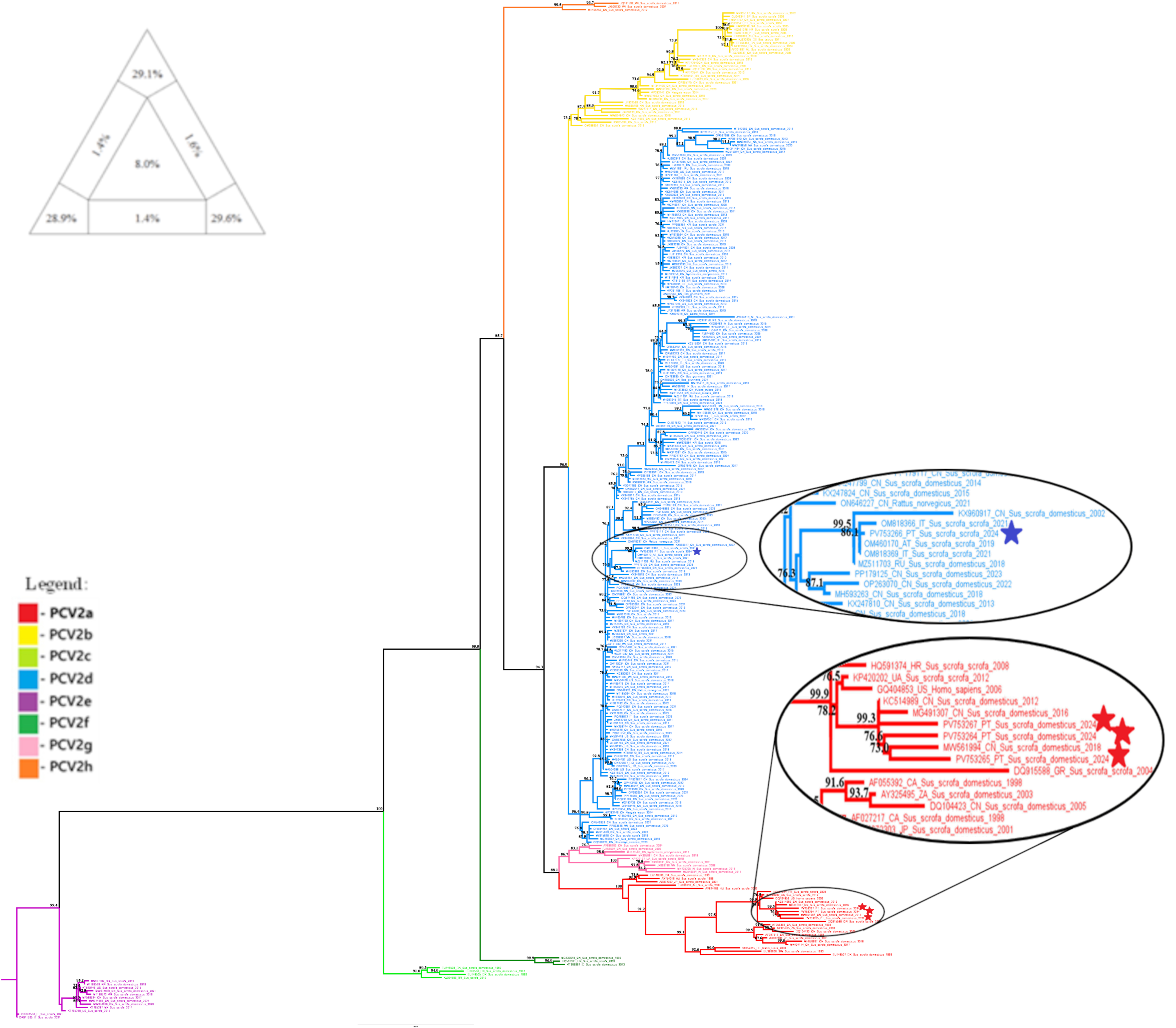 - Almeida, B.; Duarte, M.D.; Duarte, A.; Fagulha, T.; Ramos, F.; Luís, T.; Caetano, I.; Barros, S.C.; dos Santos, F.A.; Henriques, A.M. Comprehensive Survey of PCV2 and PCV3 in Domestic Pigs and Wild Boars Across Portugal: Prevalence, Geographical Distribution and Genetic Diversity. Pathogens 2025, 14, 675. [Google Scholar] [CrossRef] [PubMed]