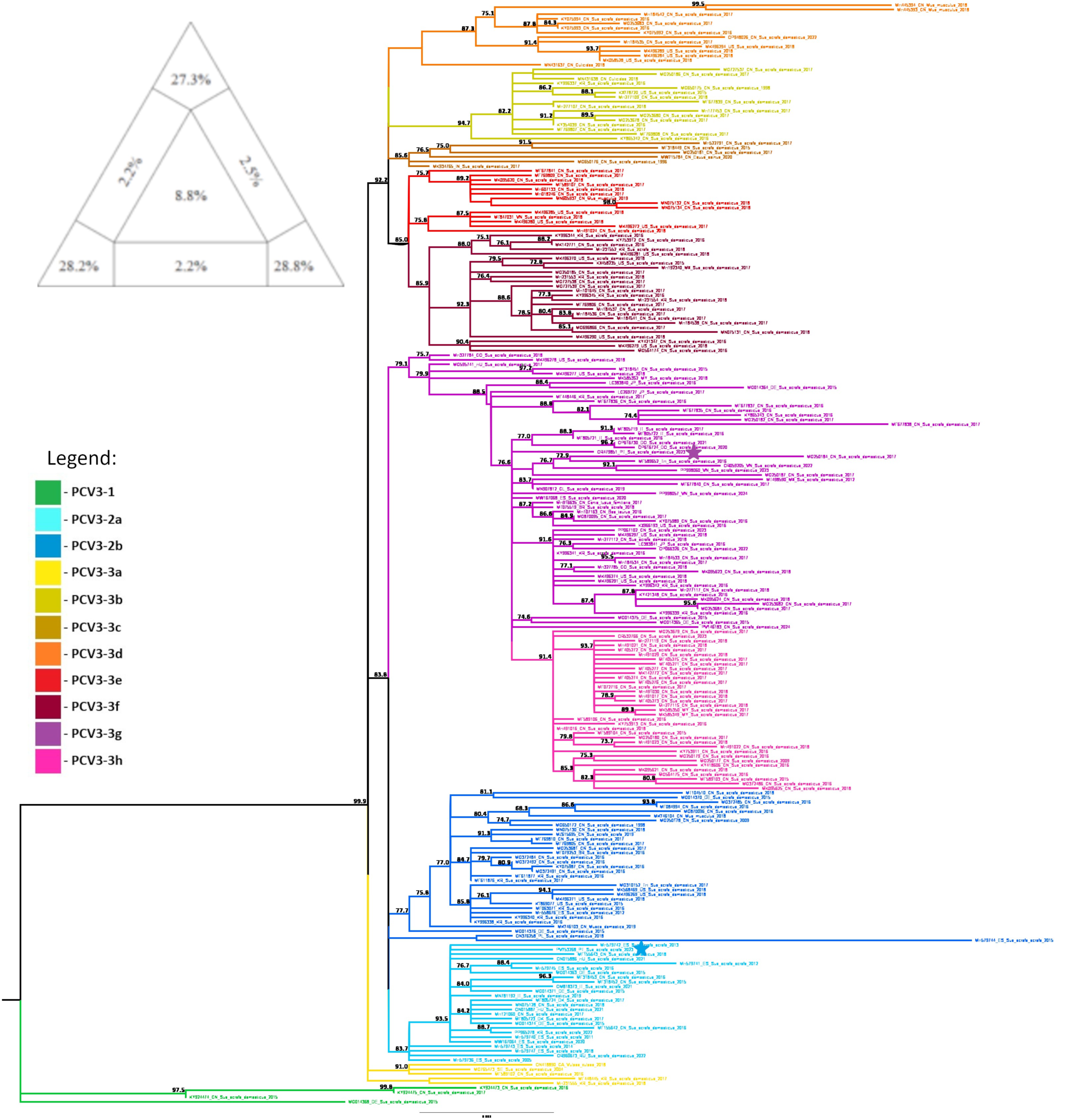 - Fux, R.; Söckler, C.; Link, E.K.; Renken, C.; Krejci, R.; Sutter, G.; Ritzmann, M.; Eddicks, M. Full genome characterization of porcine circovirus type 3 isolates reveals the existence of two distinct groups of virus strains. Virol. J. 2018, 15, 25. Available online: https://virologyj.biomedcentral.com/articles/10.1186/s12985-018-0929-3 (accessed on 30 September 2025). [CrossRef]