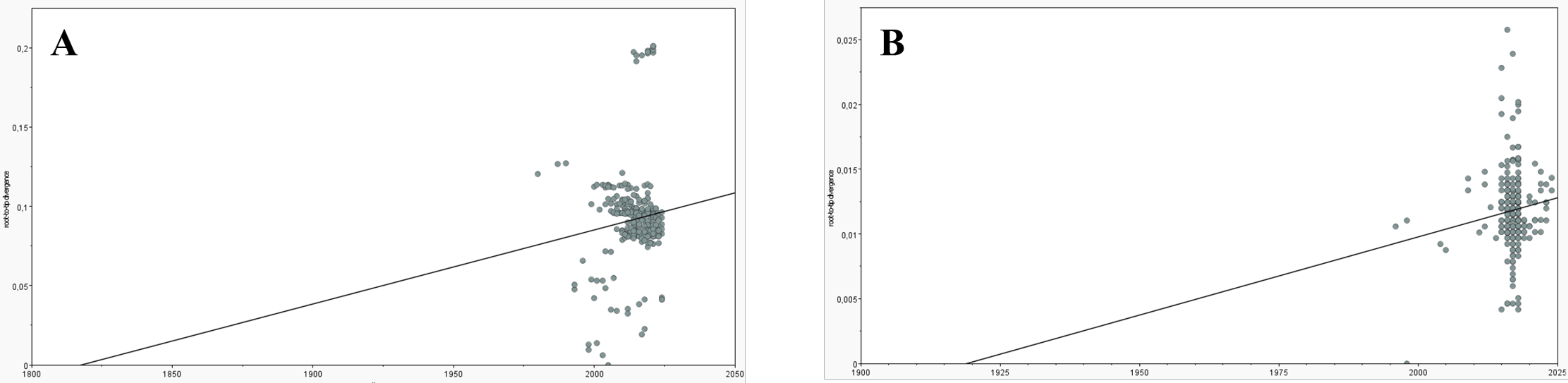 - Rambaut, A.; Lam, T.T.; Max Carvalho, L.; Pybus, O.G. Exploring the temporal structure of heterochronous sequences using TempEst (formerly Path-O-Gen). Virus Evol. 2016, 2, vew007. [Google Scholar] [CrossRef]
