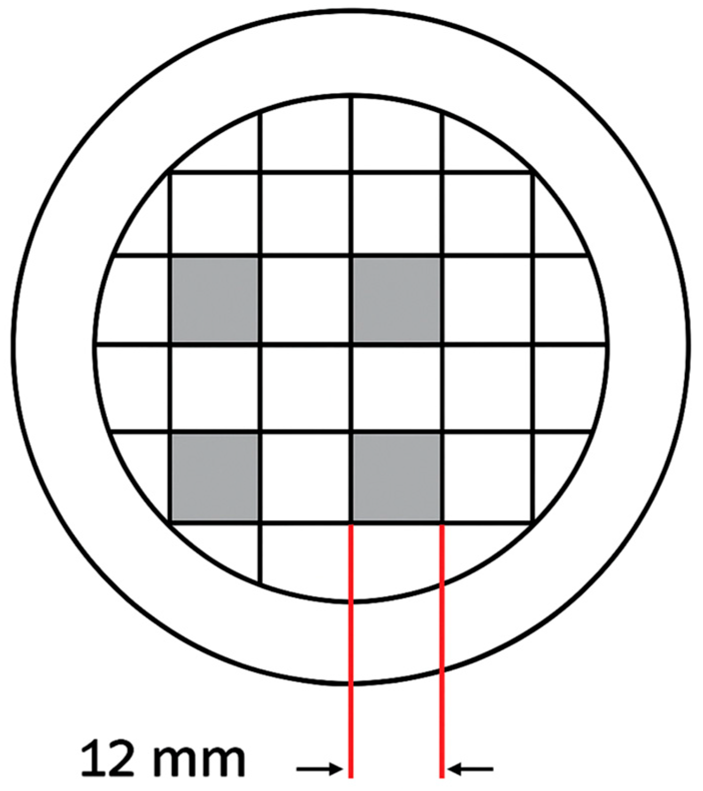 Figure 2. Schematic of the irradiated grid showing the selected squares on the agar plates. The top left square was irradiated with 80 mJ, the top right with 130 mJ, the bottom left with 180 mJ, and the bottom right with 230 mJ.
