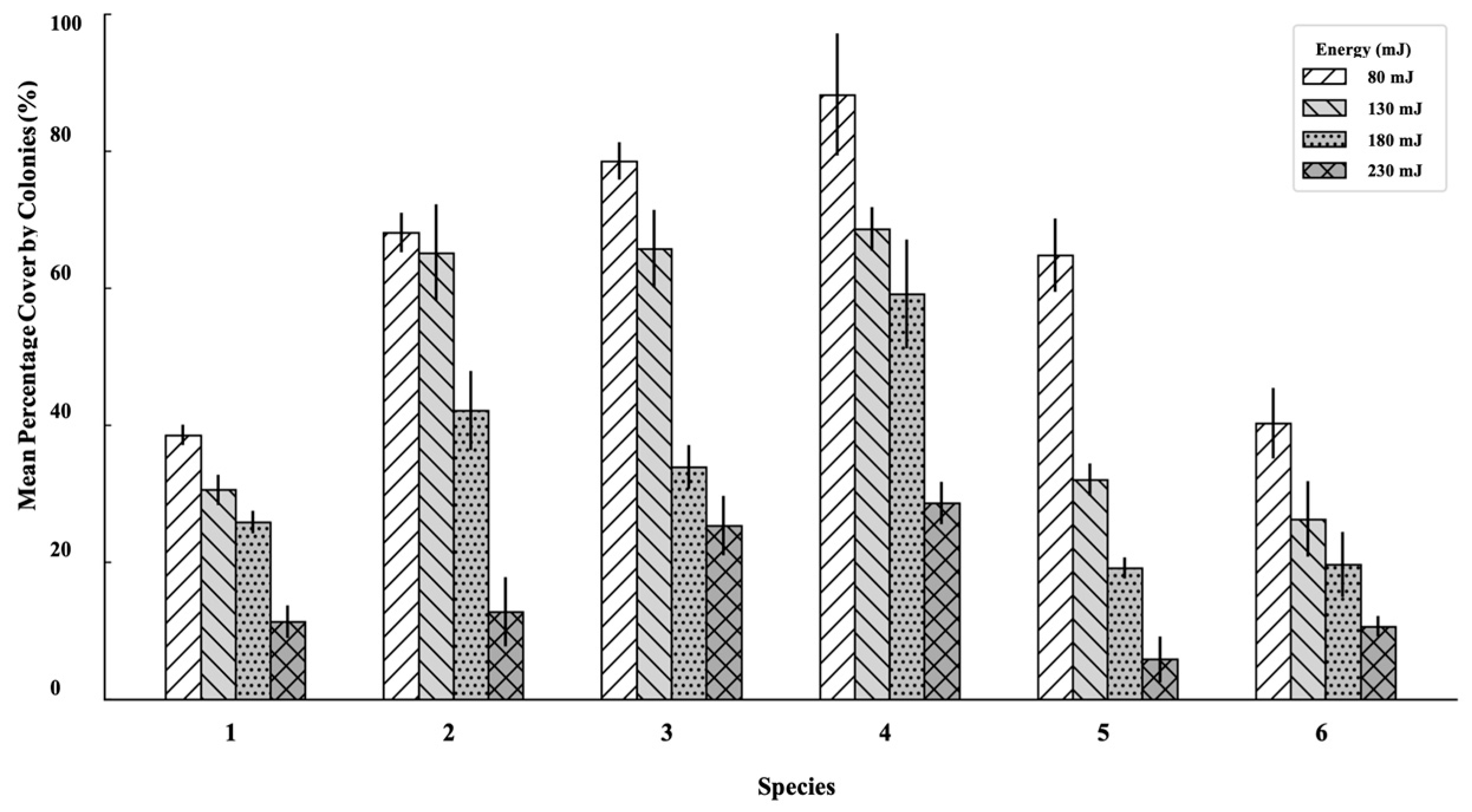 Figure 7. Effect of Er:YAG laser energy on the mean percentage surface coverage of viable coverage for six single-species cultures. The bar chart shows the mean (±SD) percentage of surface area covered by surviving colonies after laser irradiation at four different energy levels (80, 130, 180, and 230 mJ). Error bars represent the standard deviation. (1) Escherichia coli ATCC 25922 (2) Staphylococcus aureus ATCC 25923 (MSSA) (3) Staphylococcus aureus ATCC 43300 (MRSA) (4) Enterococcus faecalis ATCC 29212 (5) Pseudomonas aeruginosa ATCC 27853 (6) Candida albicans ATCC 10231.