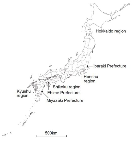 Geographic distribution of Oz virus isolates and sampling site in this study. Map of Japan showing the locations related to Oz virus studies. In this study, wild boar serum samples were collected in Miyazaki Prefecture, located in the Kyushu region. Oz virus has previously been isolated from Amblyomma testudinarium ticks in Ehime Prefecture (Shikoku region) and from a human patient in Ibaraki Prefecture (Honshu region). The map also indicates the major geographic regions of Japan (Hokkaido, Honshu, Shikoku, and Kyushu).