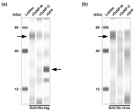 To evaluate the antigenicity of the recombinant proteins, Western blotting was performed using a fully automated Western blot analyzer (SimpleWestern Abby, Bio-Techne, Minneapolis, MN, USA) as described previously [19]. The recombinant proteins were lysed in 4× Bolt LDS sample buffer (Thermo Fisher Scientific) containing 2% β-mercaptoethanol (Bio-Rad Laboratories, Hercules, CA, USA) and heated at 70 °C for 10 min. Recombinant proteins at final concentrations of 2.5 ng/μL and 5.0 ng/μL were subjected to Western blot analysis. Both a rabbit anti-His-tag polyclonal antibody (Thermo Fisher Scientific) and rabbit serum immunized with Oz virus were used as primary antibodies. The Anti-Rabbit Detection Module (Bio-Techne) was used as the secondary antibody for detection. The expected molecular weights of rOzNP-N, rOzNP-C, and rGFP were 54.8, 55.4, and 27.0 kDa, respectively, as calculated using the ExPASy Compute pI/Mw tool (https://web.expasy.org/compute_pi/, accessed on 28 November 2023).