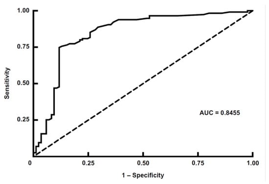 Receiver operating characteristic (ROC) curve analysis of the double-antigen sandwich ELISA for Oz virus. ROC curve showing the diagnostic performance of the double-antigen sandwich (DAgS) ELISA for detecting antibodies against Oz virus. The analysis was conducted using the optical density (OD) values obtained by the DAgS ELISA, with the 80% plaque reduction neutralization test (PRNT80) serving as the reference standard. The area under the ROC curve (AUC) was 0.8455, indicating a high discriminative ability of the assay [22]. The optimal cutoff OD value was determined to be 0.0325 based on the Youden index (sensitivity + specificity − 1) [21], yielding a sensitivity of 72.2% and a specificity of 88.2%. The diagonal dashed line represents the line of no discrimination (AUC = 0.5).