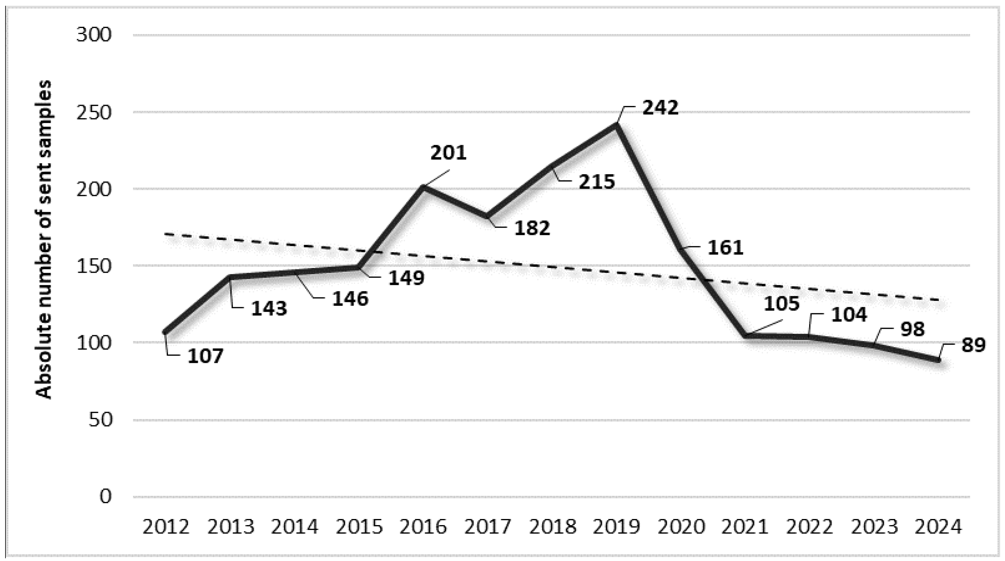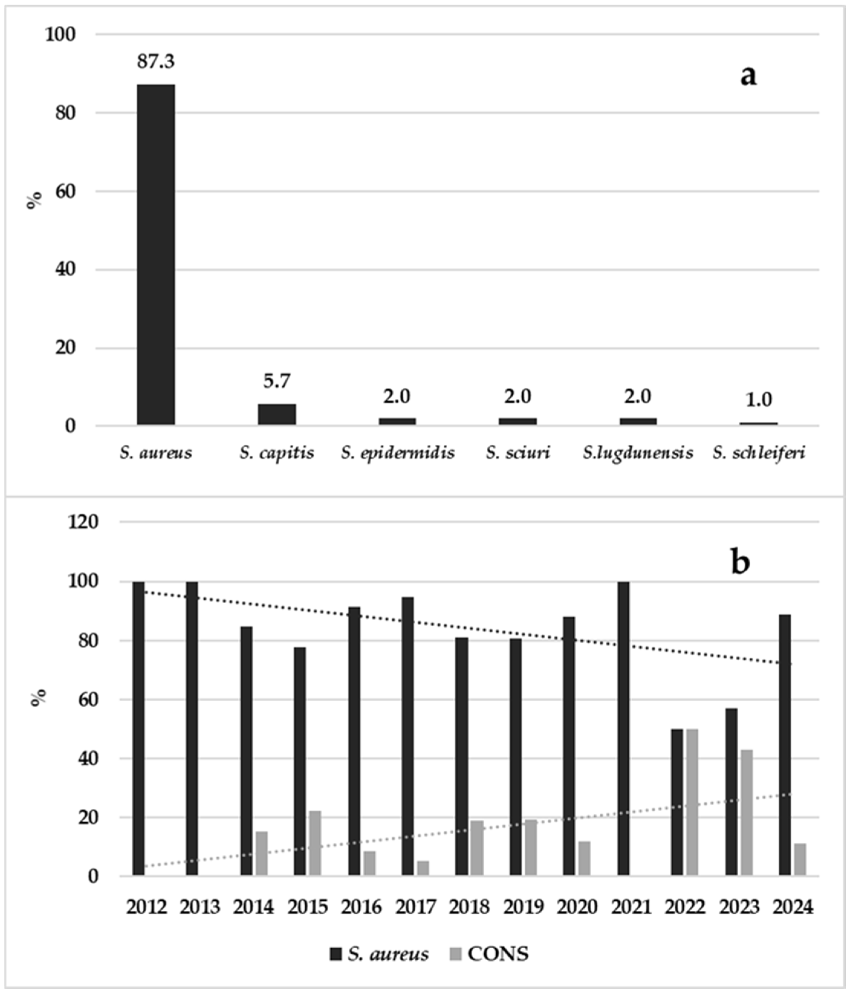 | Years | Total Sent Samples | Staphylococcus spp.-Positive Samples (%) |