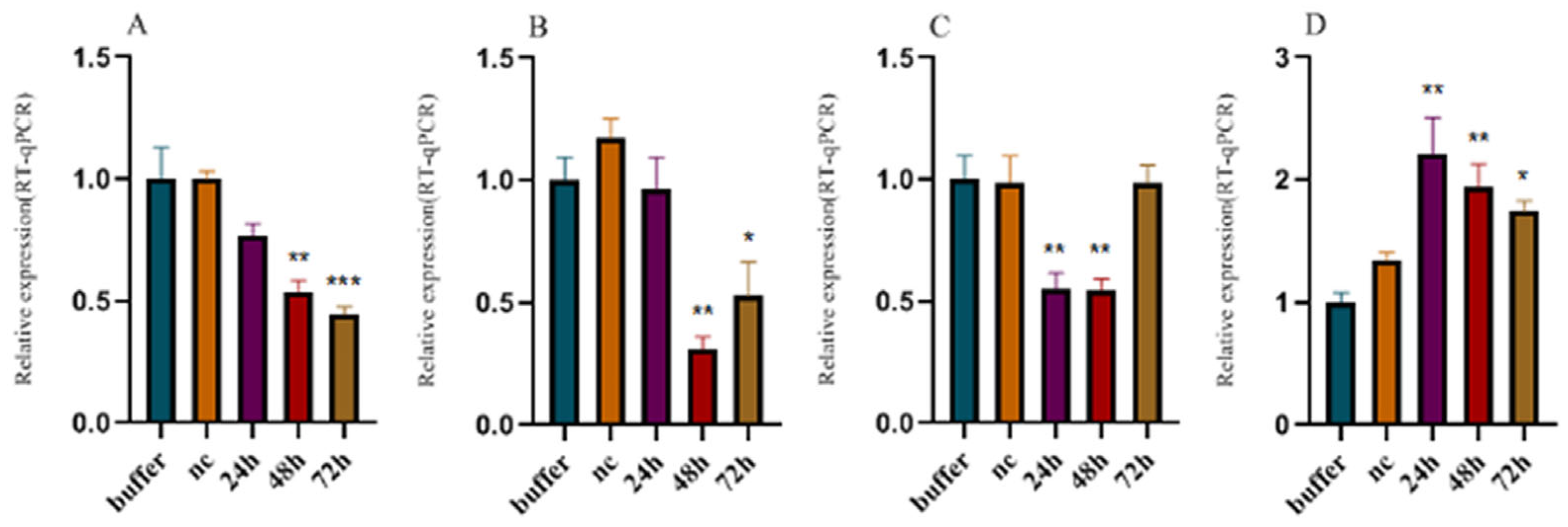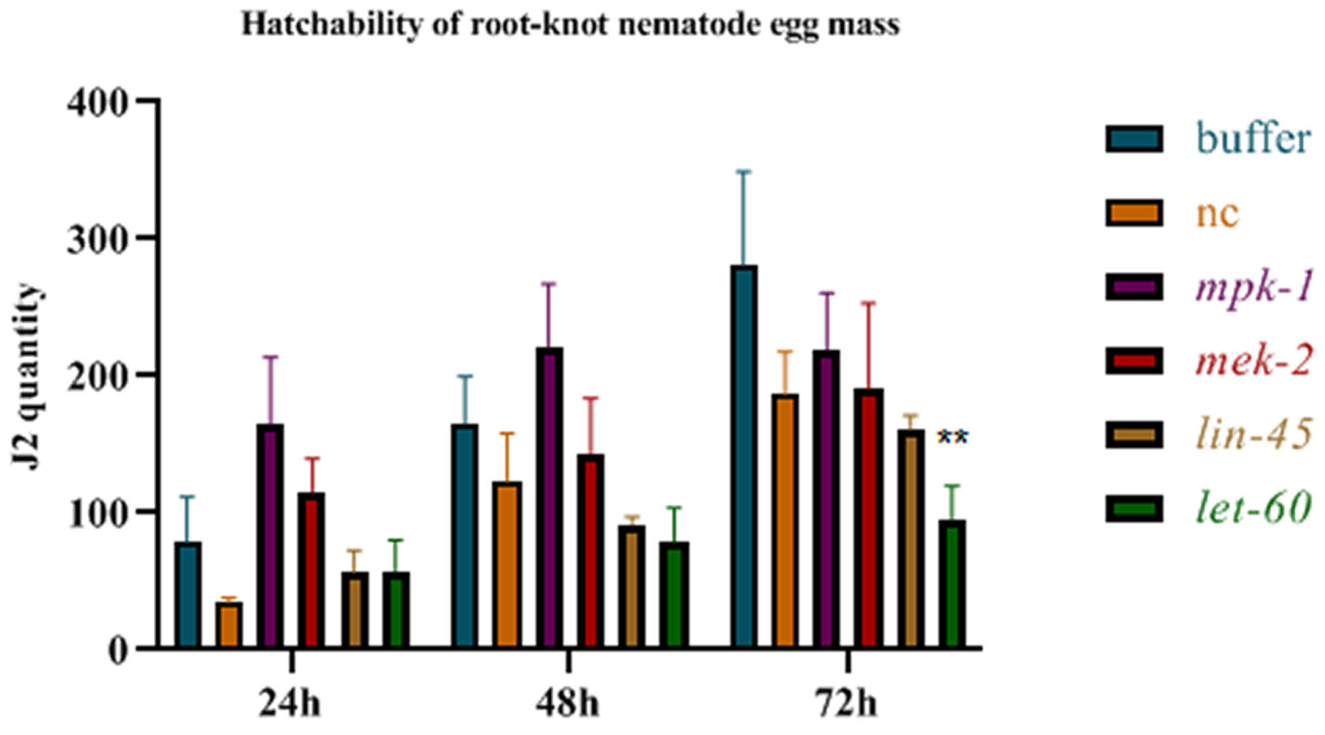 3.3. Effect of MAPK Genes on Egg Hatching Ability in Meloidogyne incognita