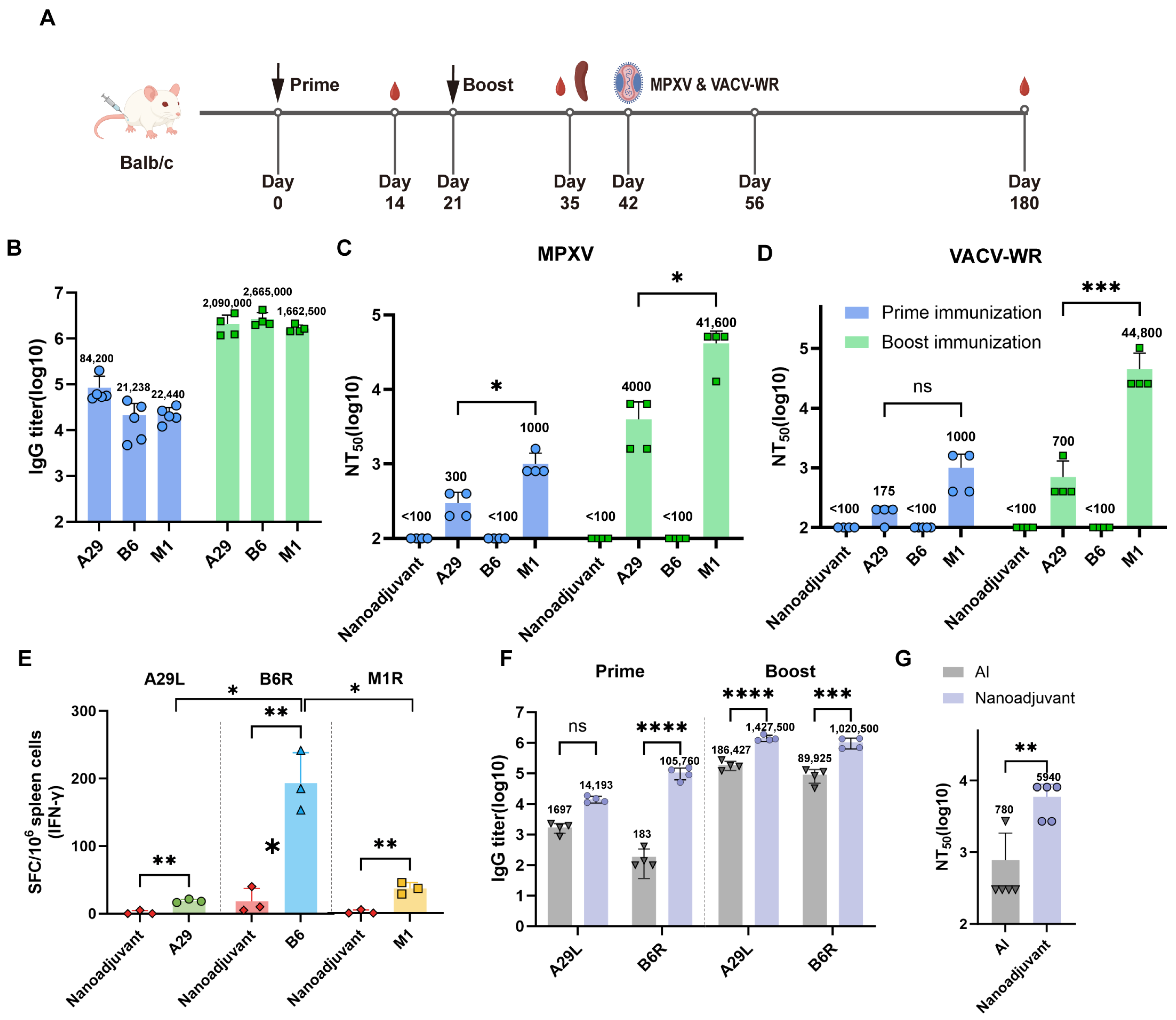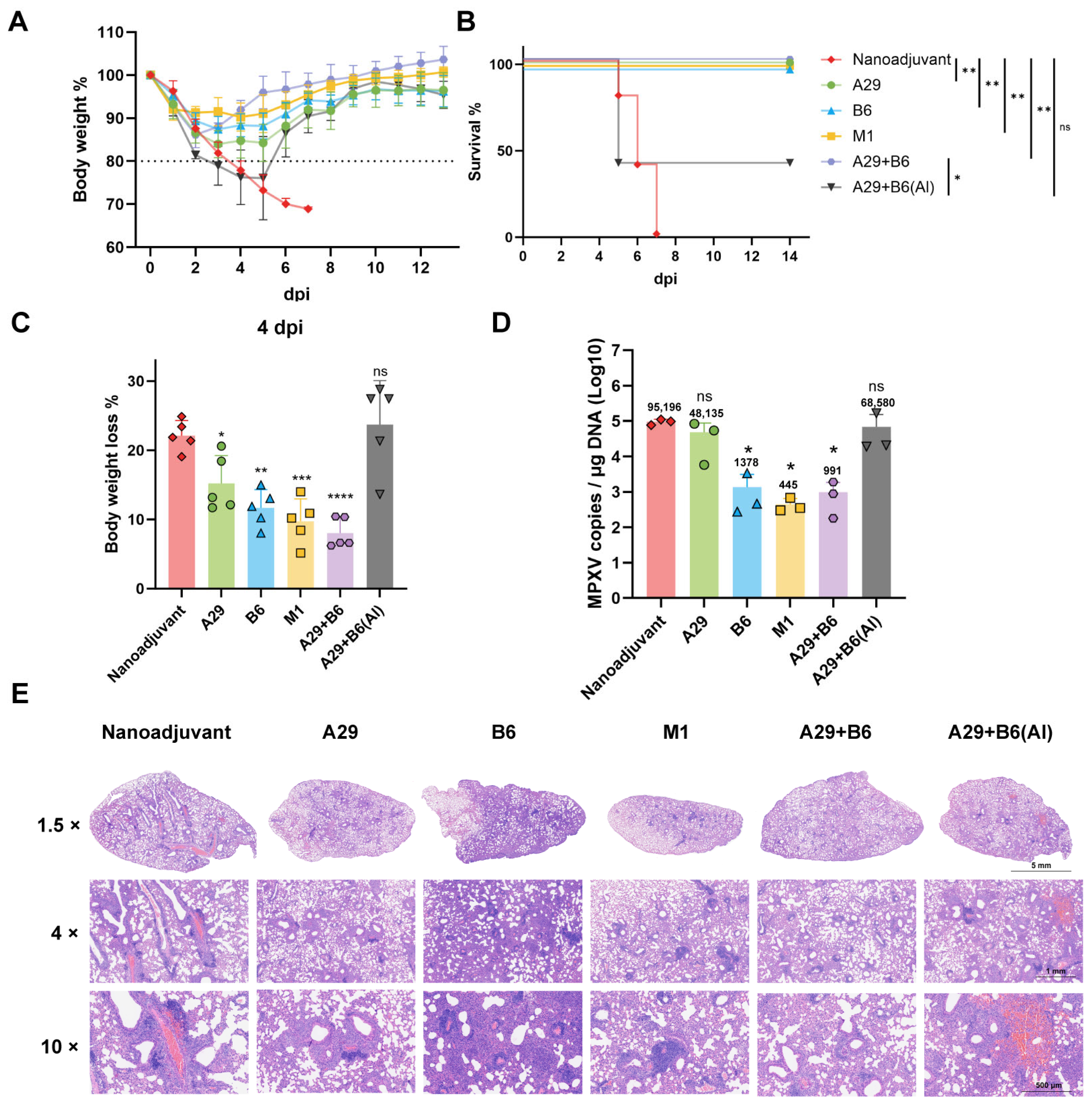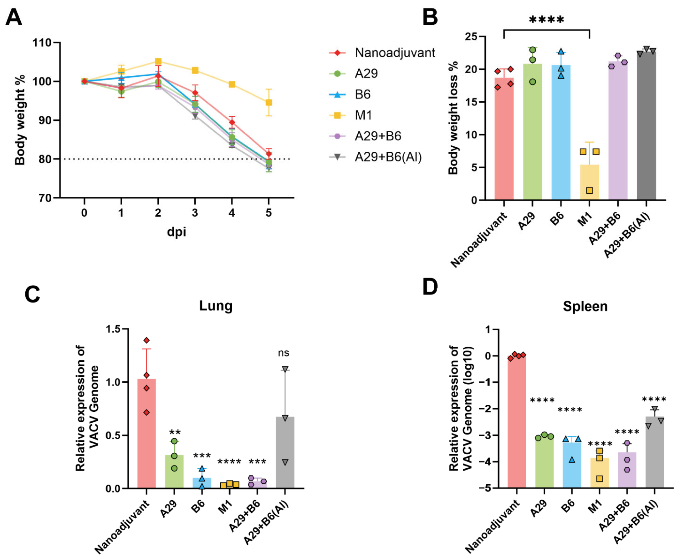 Zhang C, Liu N, Zhao Y, Pan Z, Wang D, Tang W, He Y, Zheng X, Qi Z, Zhang X, et al. Immune Responses and Protective Efficacy of Nanoemulsion-Adjuvanted Monkeypox Virus Recombinant Vaccines Against Lethal Challenge in Mice. Pathogens. 2025; 14(12):1293. https://doi.org/10.3390/pathogens14121293