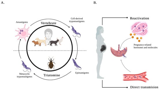 Amastigotes present in maternal tissues can be stimulated by pregnancy-related hormones and molecules, leading to their transformation into cell-derived trypomastigotes (CDTs). This reactivation causes the release of CDTs into the maternal bloodstream. These CDTs can then reach the chorionic villi of the placenta, where they can enter the fetal circulation [24,25].