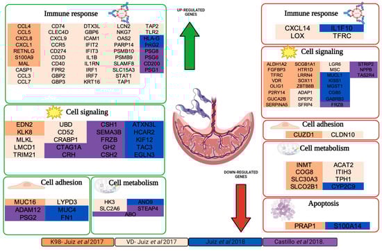 Functional categories of differentially expressed genes in the placental environment during Trypanosoma cruzi infection. This figure highlights the functional categories of differentially expressed genes (DEGs) involved in the interaction between Trypanosoma cruzi and the placental environment, which plays a critical role in the congenital transmission of Chagas disease. Up-regulated genes are shown in green boxes, while down-regulated genes are in red boxes, illustrating the biological processes activated or suppressed during infection. Background colors within the boxes correspond to the sources of the transcriptomic data, providing a clear link to the original studies and integrating findings across multiple investigations to offer a comprehensive overview of the key transcriptomic changes induced by T. cruzi [56,57,83].