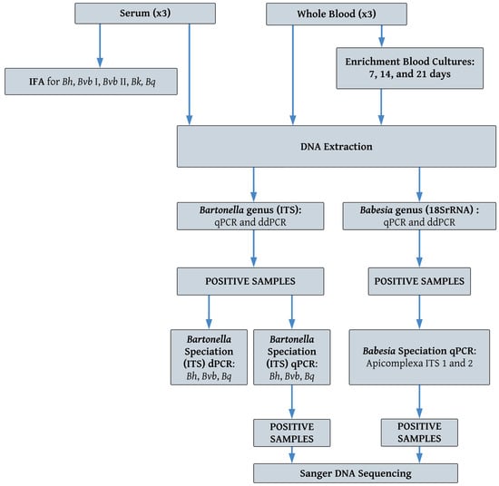 Microbiological testing approach used in this study. Bh: Bartonella henselae; Bvb I or II: Bartonella vinsonii subsp. berkhoffii genotype I or II; Bk: Bartonella koehlerae; Bq: Bartonella quintana.