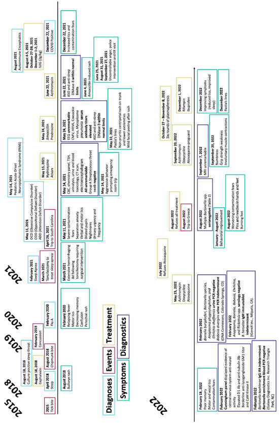 The son, born in August 2011, had a facial dermoid cyst removed at 5 months of age. At 20 months of age, a pulpectomy was required to repair a severe enamel defect (hole through tooth). Following a flu-like illness in February 2020, fever of unknown origin persisted for 2 months. Although several abnormal behavioral events were documented earlier in their son, definitive neurological manifestations began in May 2021, with psychiatric diagnoses including obsessive–compulsive disorder (OCD), oppositional defiant disorder (ODD), and attention deficit disorder (ADD). Figure 2 details the son’s historical symptoms, diagnoses, animal and vector exposures, diagnostic testing, and treatments. Despite substantial diagnostic testing, no etiology was identified as a cause of the child’s symptoms prior to the infectious disease research testing reported below.