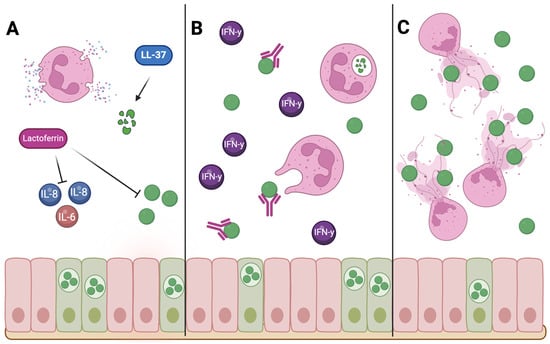 Schematic illustrating neutrophil-mediated mechanisms of protection against Chlamydia. Neutrophils can provide protection by three main mechanisms: degranulation, phagocytosis, and NET release. (A) During degranulation, neutrophils can release human cathelicidin LL-37, which has strong anti-Chlamydia activity. Lactoferrin is also released during degranulation, which can block entry of Chlamydia into host cells and decrease the secretion of pro-inflammatory cytokines during infection, potentially reducing tissue damage. (B) Neutrophils can also provide protection against Chlamydia infection by phagocytosing and killing the engulfed bacteria in the presence of IFN-γ and Chlamydia-specific antibodies. (C) NET release, which can directly kill and/or prevent the dissemination of pathogens, is another way that neutrophils might provide protection.