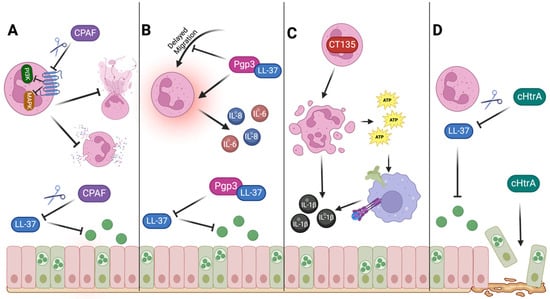 Schematic illustrating how Chlamydia can disrupt neutrophil-mediated protection. (A) CPAF can cleave the FPR2 receptor on the surface of neutrophils, which disrupts PI3K and MAPK signaling. The disruption of these signaling pathways can prevent neutrophils from degranulating or performing NET release. Another mechanism of anti-neutrophil activity by CPAF is the degradation of LL-37. This prevents LL-37 from being able to perform anti-Chlamydia functions, enhancing host cell infection. (B) Pgp3 can form a stable complex with LL-37, limiting the anti-Chlamydia functions of LL-37. The presence of Pgp3 can directly interfere with LL-37’s ability to prevent Chlamydia infection in host cells, and Pgp3/LL-37 complexes can delay neutrophil migration to the site of infection. Pgp3, free or complexed with LL-37, promotes the release of the pro-inflammatory cytokines IL-6 and IL-8 by neutrophils, which can contribute to the pro-inflammatory environment at the site of infection. (C) CT135 can destroy neutrophils that have taken up Chlamydia EBs. The presence of CT135 can trigger neutrophil cell death through TLR2/MyD88 signaling, which triggers the NLRP3 inflammasome. This results in the release of pro-inflammatory cytokines, such as IL-1β, and DAMPs, such as extracellular ATP. Macrophages can recognize the presence of extracellular ATP through the P2X7 receptor, which results in inflammasome activation and the release of pro-inflammatory cytokines, such as IL-1β. (D) cHtrA can cleave LL-37, thus preventing the anti-Chlamydia functions of LL-37. In addition, cHtrA can also degrade ECM components, which could promote Chlamydia spreading as infected cells are released and travel through the FRT.