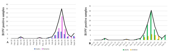 Parvovirus B19 cases from 2023 to the end of September 2024 in Siena area, Italy. (A) Number of positive samples distributed by gender; blue bars are from males and purple bars from females. (B) Number of positive samples distributed by age; green bars represent adult patients (>15 years old), and yellow bars correspond to children. This study showed that the hB19V infection was more frequent in adult females.