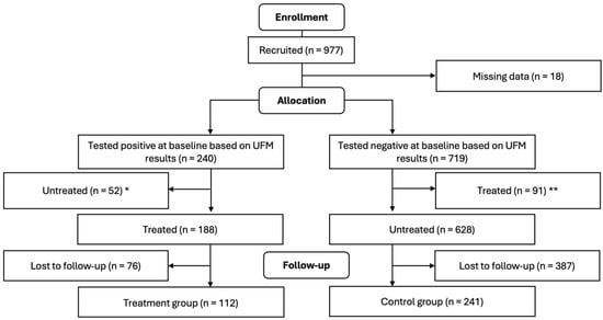 Flow diagram of study participants (treatment was single dose PZQ 40 mg/kg). * These 52 children were untreated and excluded from this study because they tested negative for hematuria in the field using urine reagent strips but were eventually found positive in the lab using UFM. ** These 91 children were treated and excluded from this study because they tested positive for hematuria in the field using urine reagent strips but were eventually found negative in the lab using UFM.