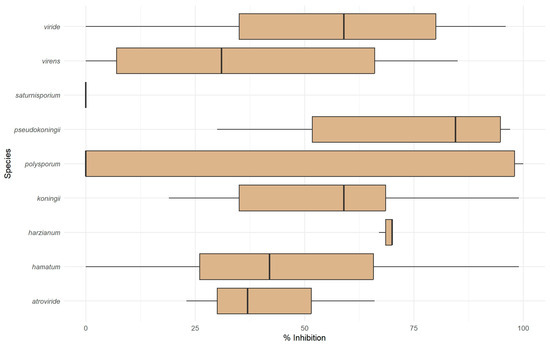 Box plot illustrating the inhibition by Trichoderma culture filtrates of P. ramorum zoospore germination and growth. The x-axis shows percent inhibition of treated P. ramorum compared to the control (0–100%). Boxes represent the interquartile range (IQR), with medians indicated by horizontal lines. Whiskers extend to 1.5 times the IQR, and outliers are displayed as individual points.