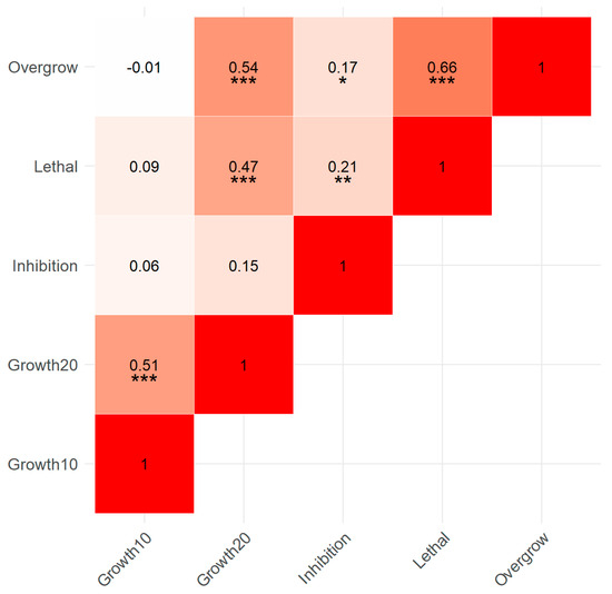 Correlation matrix showing Spearman correlation coefficients between all growth and biocontrol activity variables (growth of Trichoderma at 10 °C and 20 °C, overgrowth of P. ramorum, lethal effect on P. ramorum, and percent inhibition of P. ramorum). Darker shades indicate stronger correlations. Significance levels: *** (p < 0.001), ** (p < 0.01), * (p < 0.05).