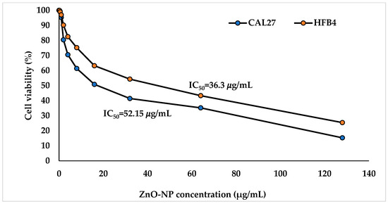 The viability of cancer cells (CAL27) and normal fibroblast cells (HFB4) after treatment with varying doses of the ZnO-NPs is shown in Figure 3. The ZnO-NPs exhibited stronger cytotoxicity against CAL27 compared to HFB4. The viability of CAL27 and HFB4 cells after treatment with 0.25–128 µg/mL ZnO-NPs ranged from 99.8% to 15.3% and 99.9% to 25.4%, respectively (Figure 3). These findings indicate that the ZnO-NPs had an IC50 of 52.15 µg/mL for CAL27 cells and 36.3 µg/mL for HFB4 cells. This supports the reliability and selectivity of the ZnO-NPs, which is consistent with the findings of Babayevska et al. [57] and Naiel et al. [56], who demonstrated that the ZnO-NPs are more destructive to cancer cells than to normal cells at comparable concentrations. These results align with previous studies [59,60]. The cytotoxicity induced by the ZnO-NPs in cancer cells is linked to the generation of ROS. Chakraborti et al. [61] argued that ROS production is primarily responsible for the anticancer effects of PEG-modified ZnO-NPs.