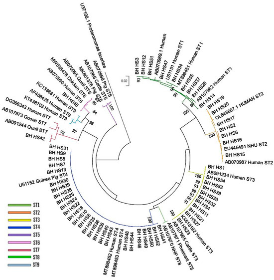 Overall, 9 sequences were assigned to subtype ST1 (9/55; 16.4%) with 3 isolates (BHHS3, BHHS12, BHHS51) showing identical sequences; 7 to subtype ST2 (7/55; 12.7%) with BHHS19 and BHHS2 equal to BHHS20 and BHHS6, respectively; 11 to subtype ST3 (11/55; 20%) with all identical sequences except for BHHS1 and BHHS23; and 26 to subtype ST4 (26/55; 47.3%), with sequences that were all identical. Additionally, two samples were attributed, one to subtype ST6 (1/55; 1.8%) and the other to subtype ST7 (1/55; 1.8%). Representative sequences within each subtype were deposited in GenBank under the accession numbers PQ483073–PQ483086; PQ565643–PQ565647.