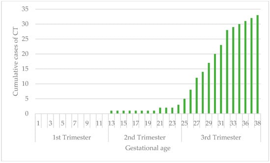 According to the literature, the overall transmission rate from mother to fetus increases with gestational age, with no CT in the group of periconceptional infection and SC in the first trimester [,,,,,,].