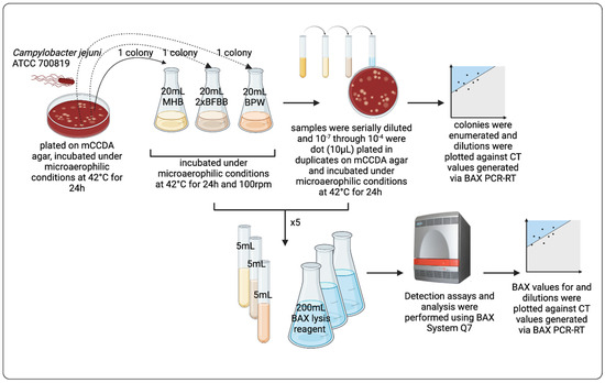 The detection limits of the BAX® System were assessed from pure cultures of the Campylobacter grown in three different media. After the cultures were grown in three different media, samples were 10-fold serially diluted, and 10−7 to 10−4 dilutions were dot-plated (10 μL) in duplicates on mCCDA plates, incubated under microaerophilic conditions at 42 °C for 24 h, and enumerated the next day. All original and diluted samples were quantified via BAX® Q7-RT PCR (KIT2018, Hygiena, Camarillo, CA, USA) using the Campylobacter species assays (following the manufacturer’s instructions). Briefly, 5 mL of each sample was added to cluster tubes with 200 mL of prepared BAX® System lysis reagent. Lysis was performed by heating the tubes for 20 min at 37 °C and 10 min at 95 °C and then cooling the tubes at 4 °C for at least 5 min. Lysate was used to hydrate a PCR tablet for the BAX® System assays. PCR tubes were loaded into the BAX® System Q7 instrument and run according to the procedure described in the BAX® System user guide. All samples were examined in five replicates. The results were analyzed with BAX® Q7 software (version 2.8). Detection curves of the BAX® RT systems were generated based on the PCR threshold cycle (CT) values. Phenotypical characteristics confirmed presumptive positive Campylobacter colonies. This study was performed on three separate timely independent trials. The overview of the experimental design is described in Figure 1.