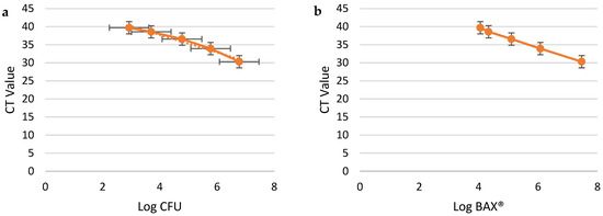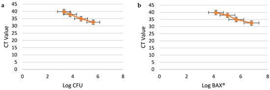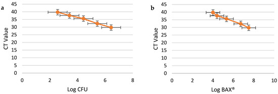 Campylobacter jejuni dilution samples in Mueller–Hinton Broth. X-axis: Log CFU/mL plate count; Y-axis: CT values from BAX® RT-PCR (a). X-axis: Log CFU/mL from BAX® RT-PCR; Y-axis: CT values from BAX® RT-PCR (b). Data were evaluated through a linear-fit equation applied to Log CFU and CT values (y = −2.5971x + 46.583, R2 = 0.9946, and RMSE = 0.2634) (a) and Log BAX® and CT values (y = −2.6677x + 49.949, R2 = 0.9884, and RMSE = 0.3861) (b).