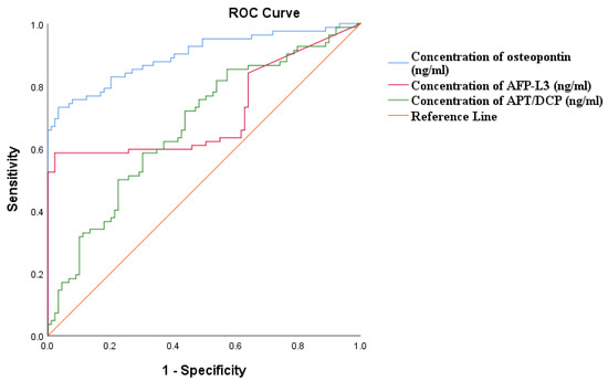 The receiver operating characteristics (ROC) curve shows the diagnostic ability of the three biomarkers, at different concentration threshold points. Osteopontin had the largest area under the curve (AUC = 0.897) and has the highest overall diagnostic accuracy for detection of HCC, with sensitivity and specificity values of 0.829 and 0.796, respectively. However, all biomarkers showed significant utility in diagnosing HCC (p < 0.001, Figure 2 and Table 6).