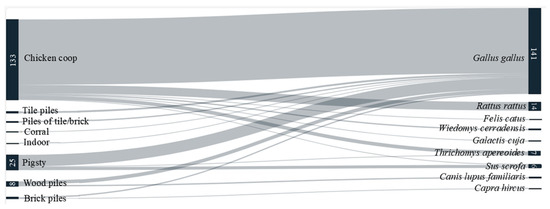 We also assessed the food source for T. sordida in relation to the ecotopes where the specimens were captured. As expected, most triatomines that fed on G. gallus were collected in chicken coops, although other food sources were also detected in this ecotope. Notably, all insects fed on R. rattus were captured in chicken coops, as with other rodents and mammals such as F. catus, W. cerradensis, G. cuja, T. apereoides, and S. scrofa. Specimens captured indoors had fed primarily on G. gallus (Figure 2).