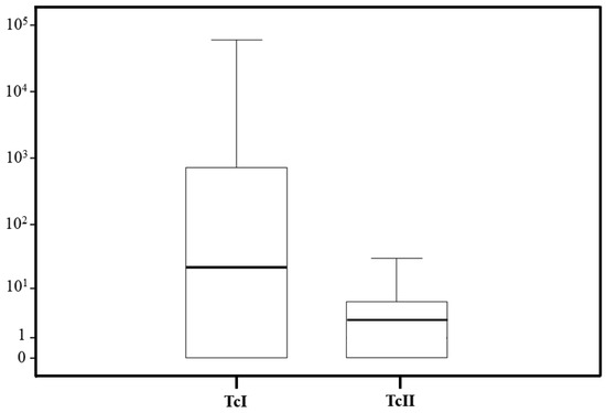 Quantification assays using qPCR revealed parasite loads in 47 T. sordida infected with TcI, nine infected with TcII, two infected with TcIII, one infected with TcV, and three infected with mixed DTUs. Due to the small sample sizes, comparisons were only made between TcI and TcII. The highest observed parasite loads were 6.1 × 104, 1.2 × 102, and 48 for TcI, TcII, and mixed infections, respectively. The lowest parasite loads were 0.0001, 0.0004, and 0.008, respectively. Median parasite loads were 22 for TcI, 4.8 for TcII, and 5.8 T. cruzi/intestine equivalents for mixed infections. No significant differences were observed in T. cruzi load between TcI and TcII (p-value = 0.506) or for mixed infections (p-value = 0.315) (Figure 3).