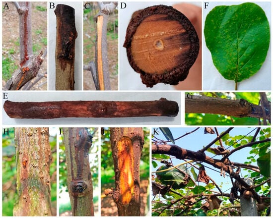 Disease symptoms in the field: (A–C) kiwifruit samples were collected in December 2023 from Cangxi County, Guangyuan City; (D–F) kiwifruit samples were collected from Dujiangyan City in March 2024; (G–K) kiwifruit samples were collected in August 2024 from Mabian County, Leshan City.