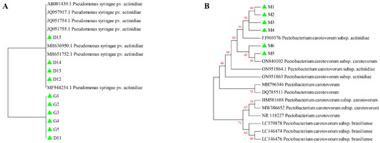Using the DNA of 34 strains as templates, PCR amplification was performed with universal primers (Table S1) for 16S rRNA, resulting in amplified fragments of approximately 1500 bp for all samples. The sequence analysis of PCR products indicates that the isolates from Dujiangyan and Guangyuan are both Pseudomonas syringae pv. actinidiae, whereas the isolates from Leshan are Pectobacterium carotovorum subsp. actinidiae (Table 1).