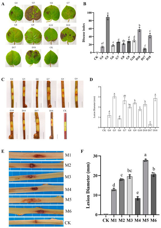 Pseudomonas syringae pv. actinidiae (Psa) pathogenicity tests: (A) the disease symptoms on kiwifruit leaves after inoculating with different isolates of Psa suspensions and water for 6 days under in vitro conditions; (B) disease index represents the statistical area of disease lesions; (C) the disease symptoms on kiwifruit branch after inoculating with 10 isolates of Psa suspensions and water for 17 days under in vitro conditions; (D) lesion diameter was measured to indicate the level of Psa pathogenicity; (E) the disease symptoms on kiwifruit branch after inoculating with 10 isolates of Psa suspensions and water for 17 days under in vitro conditions; (F) lesion diameter was measured to indicate the level of Pca pathogenicity. CK represents the control group treated with sterile water. Different lowercase letters indicate significant differences in lesion diameter at p < 0.05. The experiments were performed independently three times and representative results are shown.