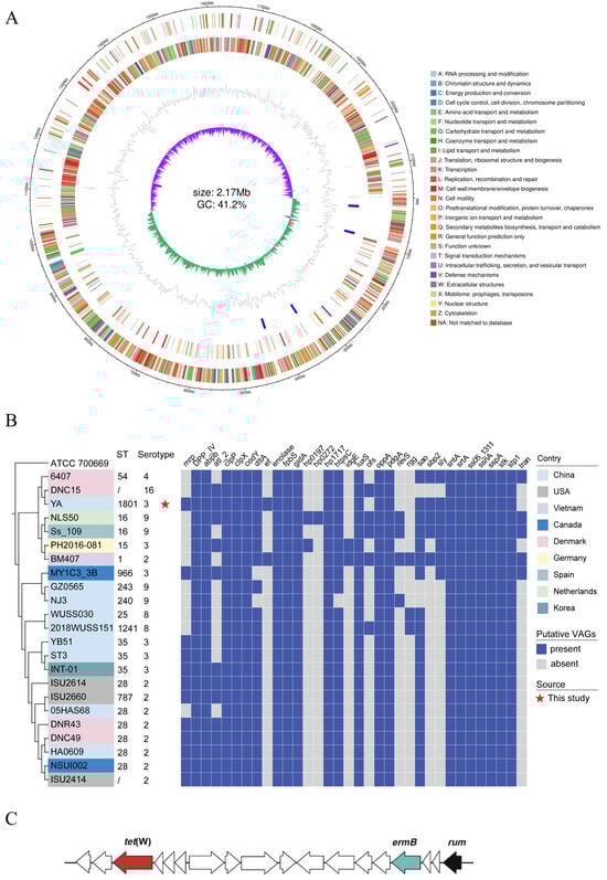 The S. suis strain YA genomic features and bioinformatic analysis. (A) Circular map of the S. suis YA genome generated using R package Circlize. (B) The phylogenetic tree and information of STs and putative virulence-associated genes (VAGs) for the S. suis serotype 3 strain YA and other serotype strains. The phylogenetic tree was constructed based on the SNPs of the core genome. The S. pneumoniae ATCC 700669 (NC_011900) was used as an outgroup to root the tree. (C) Genetic context of antibiotic resistance genes in S. suis serotype 3 strain YA.