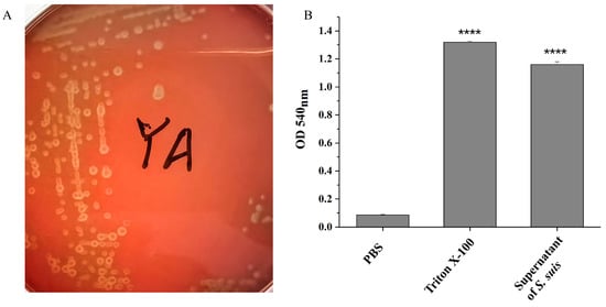 Hemolysis analysis of the S. suis strain YA. (A) Colony morphology of the S. suis strain YA on sheep blood agar plates. (B) The OD 540 nm value of PBS (negative control), Triton X-100 (positive control), and supernatant of S. suis culture. **** indicates a highly difference compared to the PBS group (p < 0.0001).