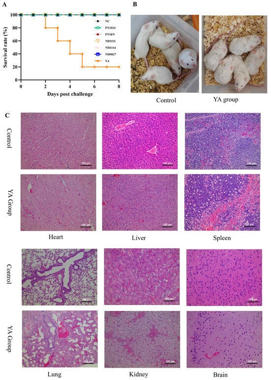Pathogenicity of the S. suis strain YA in Kunming mice. (A) Survival rate of mice in each group after infection with different strains of S. suis. (B) Clinical symptoms of mice infected with S. suis strain YA with neurological symptoms, as well as rough and messy fur. (C) Histopathological changes in the heart, liver, spleen, lung, kidney, and brains of uninfected mice and mice infected with the S. suis strain YA.