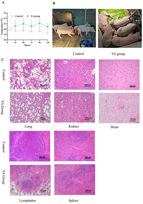 Pathogenicity of the S. suis strain YA in 25-day-old piglets. (A) Temperature changes in piglets after the challenge. (B) Clinically normal control group and fervescence, mental depression, hemiplegia and inability to get up with clinical manifestations in challenged piglets. (C) Histopathological changes in the lung, kidney, brains, lymphaden, and spleen of uninfected piglets and those infected with strain YA.